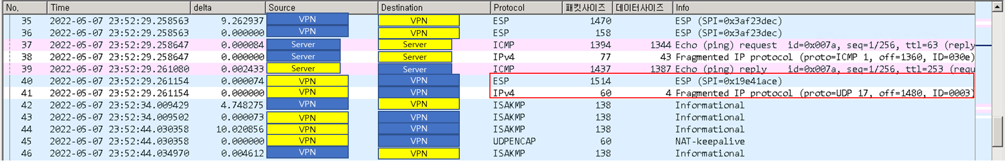④ 목적지 VPN에서 Encapsulation 하여 보냈는데 ESP가 1514 bytes를 초과하게 되어 Fragmentation 발생함